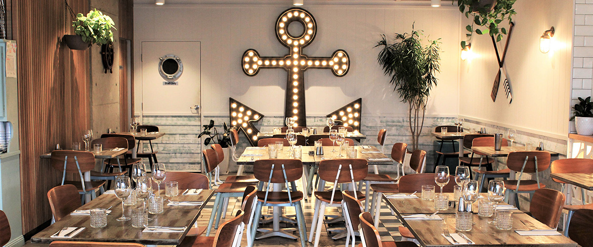 Seafood, steaks and international share plates in a beachfront dining spot with urban-chic interiors